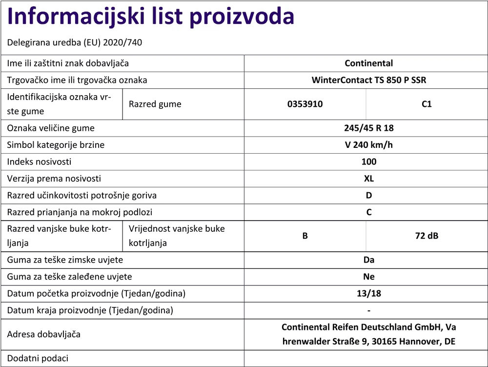 03539100000, WinterContact TS 850 P, CONTINENTAL, Zimska, Guma za osobna vozila, SSR, FR, XL, 3PMSF; M+S, *, MOE, oznaka: kl. učinkovitosti potrošnje goriva - D; kl. učinkovitosti na mokroj podlozi -| Širina gume | 245 |